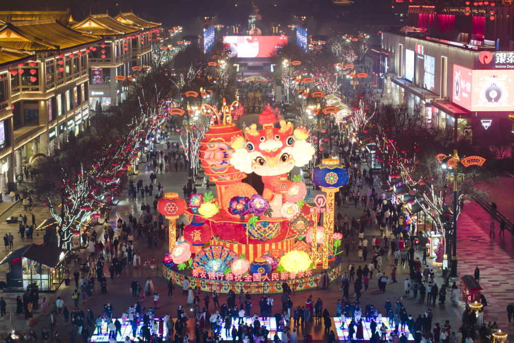 市民游客在西安大唐不夜城游玩、消費(1月22日攝,無人機照片)。新華社記者 邵瑞 攝