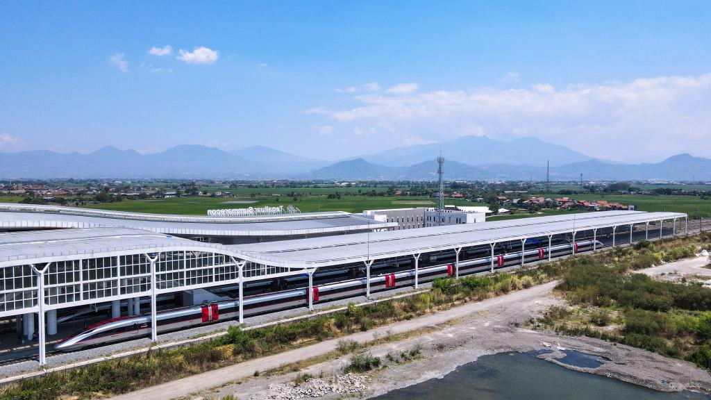 圖為2024年9月13日在印度尼西亞萬隆德卡魯爾站拍攝的停靠在站臺上的雅萬高鐵高速動車組(無人機照片)。新華社記者徐欽攝