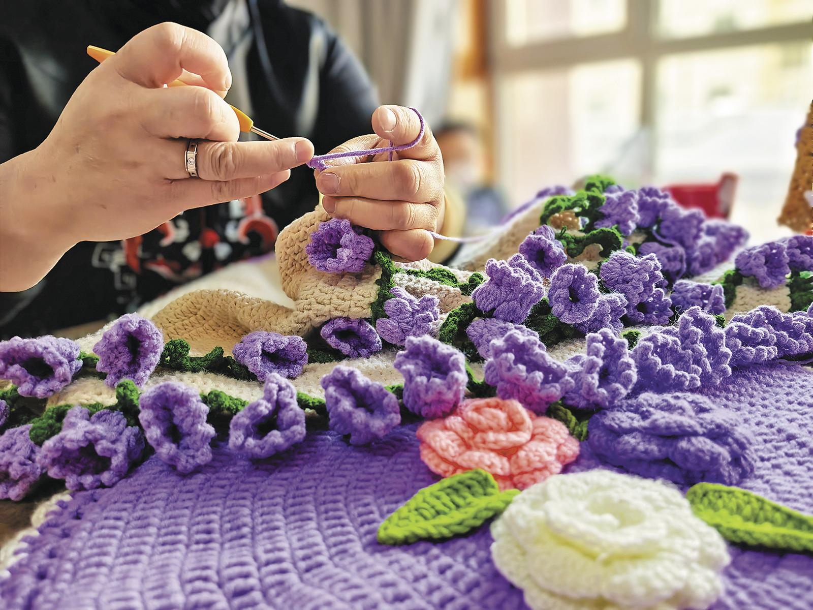 找到了目標(biāo)就馬上行動,蓋毯、杯墊、發(fā)箍,玫瑰花、郁金香、鈴蘭花……各種花型的各類產(chǎn)品經(jīng)過她的一雙巧手被“創(chuàng)造”出來,成為工作室里最吸睛的“裝飾”,也吸引不少群眾前來“拜師學(xué)藝”。