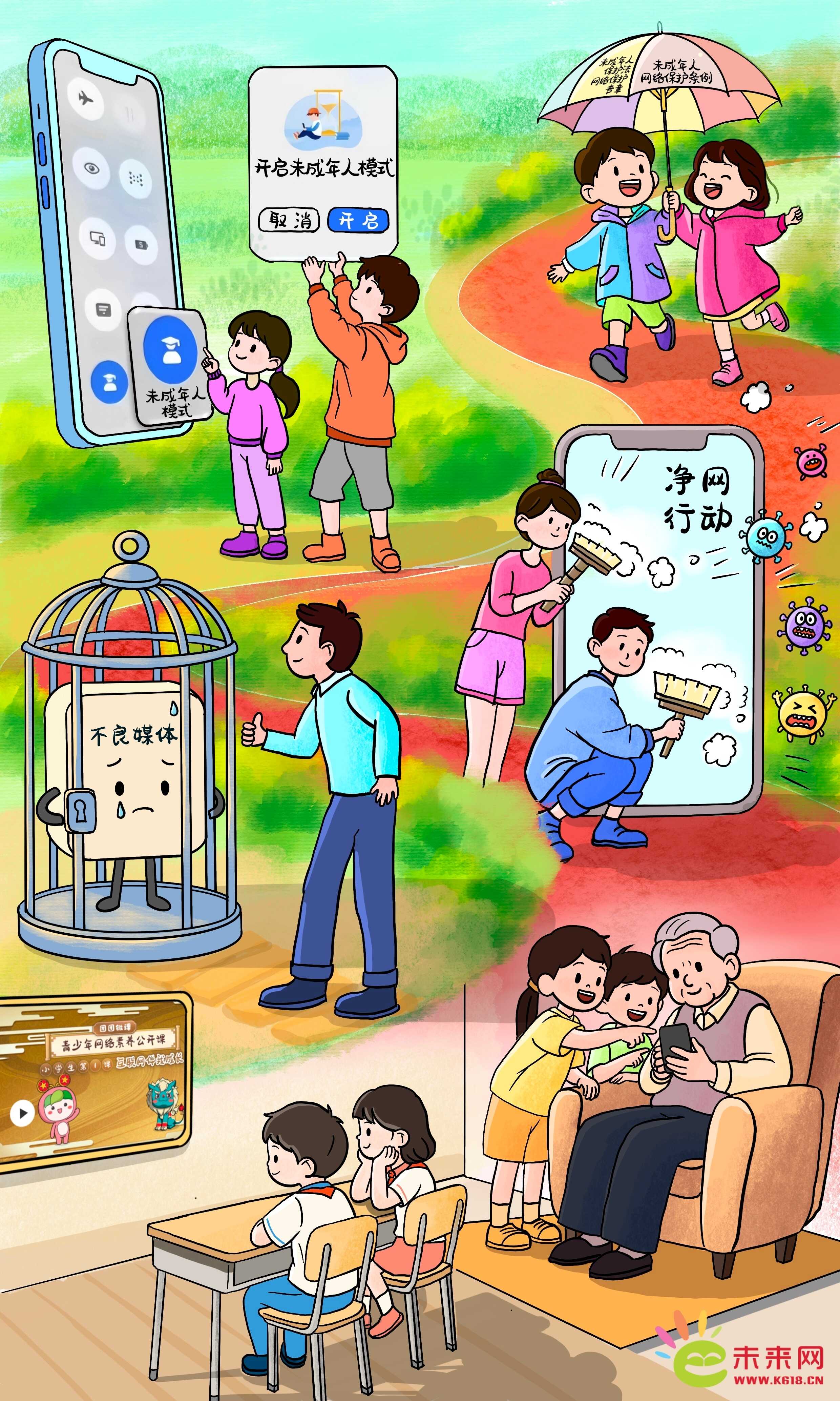 從新修訂的《中華人民共和國未成年人保護法》新增“網(wǎng)絡保護”專章,到《關于依法懲治網(wǎng)絡暴力違法犯罪的指導意見》《未成年人網(wǎng)絡保護條例》出臺,我國從立法、執(zhí)法、司法等多方面不斷織密未成年人用網(wǎng)的法治防護網(wǎng);中央網(wǎng)信辦持續(xù)開展“清朗”系列專項行動、發(fā)布《移動互聯(lián)網(wǎng)未成年人模式建設指南》,各地少先隊組織構建貫穿各級少工委、聯(lián)動報刊網(wǎng)端微屏書的少先隊全媒體矩陣,《團團微課:青少年網(wǎng)絡素養(yǎng)公開課》助力提升孩子們的網(wǎng)絡素養(yǎng)……全社會匯聚起守護清朗網(wǎng)絡環(huán)境的合力,廣大少年兒童也將成長為網(wǎng)絡文明的守護者、網(wǎng)絡強國建設的未來生力軍。