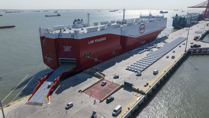 2025年4月26日,出口汽車在蘇州港太倉港區碼頭集中裝載上“深圳號”汽車運輸船(無人機照片)。新華社發(王須中 攝)