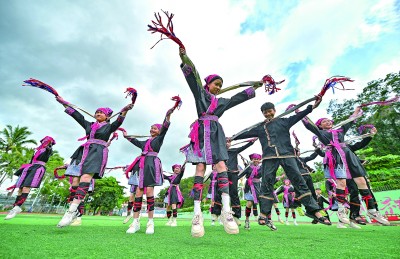 海南五指山市紅星學校學生在練習苗族盤皇舞。新華社發