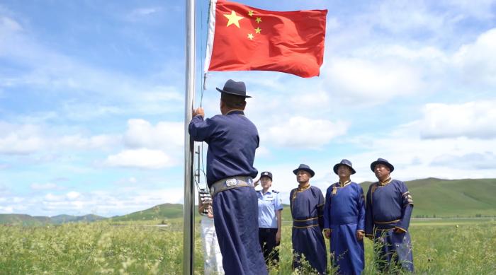 科右前旗守望草原巡防隊滿族屯分隊舉行升旗儀式。蔣豪文 攝