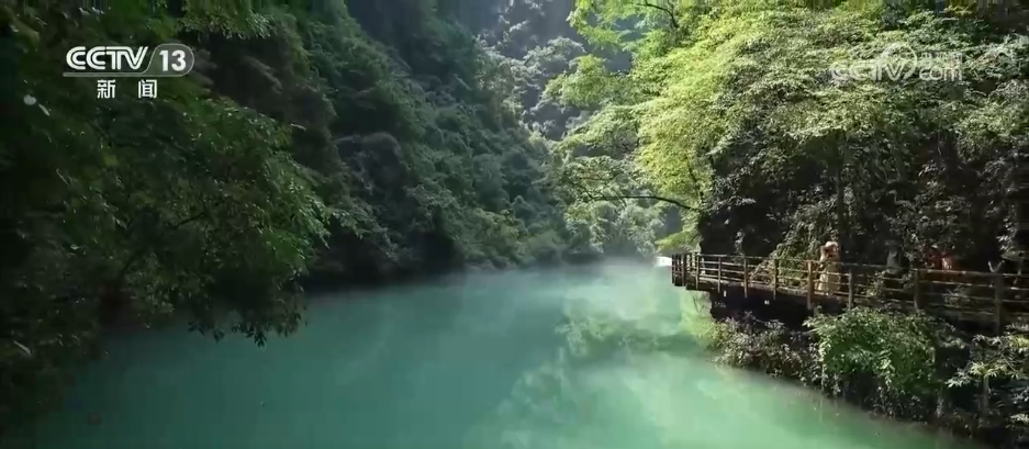 在大峽谷谷底,形態各異的峰林與緩緩流淌的溪水構成了天然畫卷,陣陣微涼的山風吹來,游客們仿佛漫步在原始森林中,在喧囂的夏天中感受到了一份難得的靜謐和涼爽。