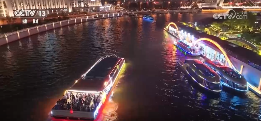 除了博物館內的精品文物給大家?guī)砹宋幕⒀纾胍购蟮暮:予步k麗,海河之夜美景再升級。沿線建筑、橋梁及碼頭的燈光景觀全面提升,飽覽海河兩岸美景的海河游船也打造了全新體驗。