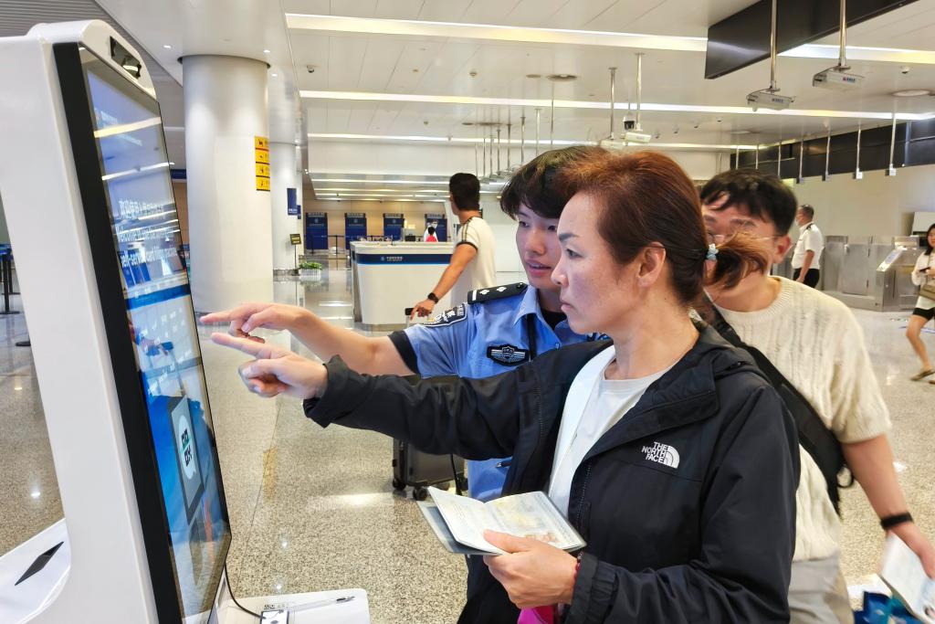 10月1日,在重慶江北國際機場,重慶出入境邊防檢查總站民警幫助韓國旅客填寫入境信息。新華社發(曾言延 攝)