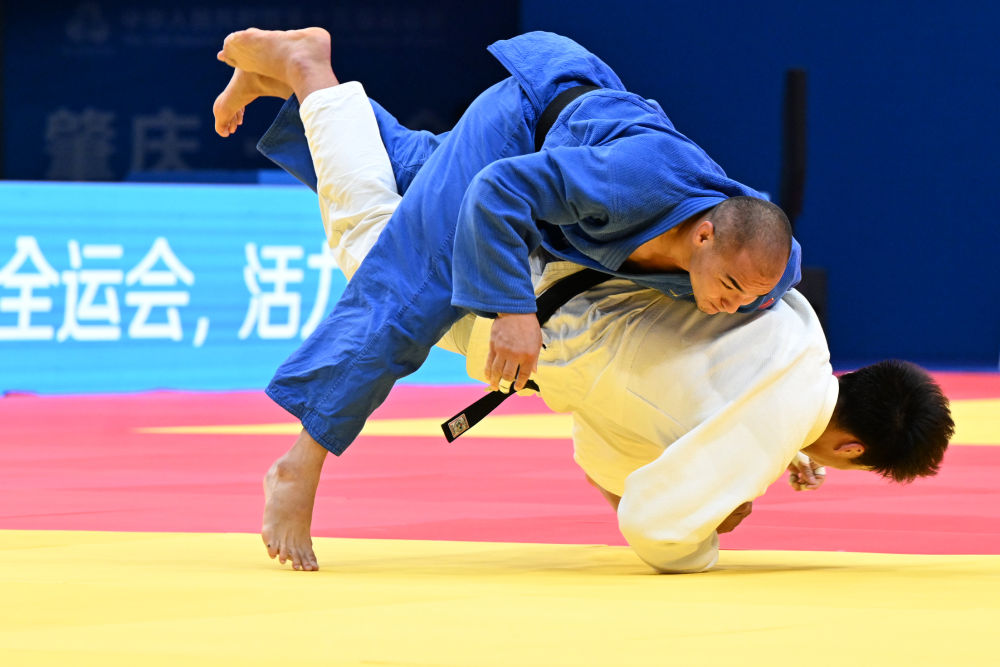 2025年11月12日,新疆隊(duì)選手阿卜杜熱西提·杰力力(上)和山東隊(duì)選手汪洋在廣東肇慶舉行的男子90公斤級(jí)銅牌賽中。新華社記者 朱祥 攝