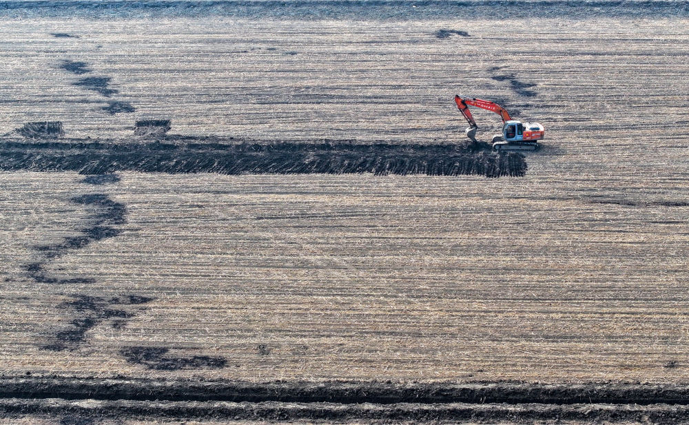 2025年3月11日,在天津市津南區八里臺鎮大韓莊村,工人駕駛挖掘機進行高標準農田施工作業(無人機照片)。新華社記者趙子碩 攝