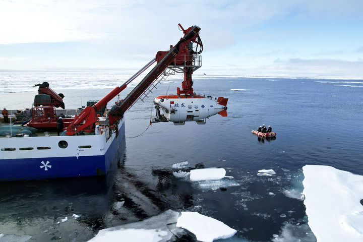 2025年8月11日,“蛟龍”號在北極冰區準備下潛。新華社記者 劉詩平 攝