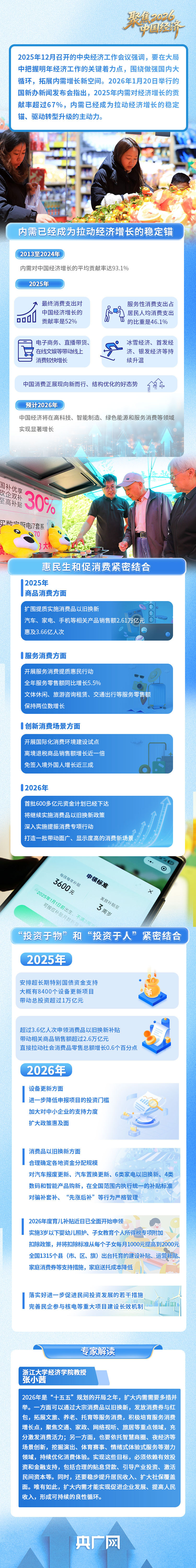 國新辦最新發布的數據顯示,2025年,內需對經濟增長的貢獻率超過67%,其中消費貢獻率達到52%。新需求引領新供給,新供給創造新需求,已經形成了良性互動。同時,國內供強需弱的矛盾比較突出,中國經濟如何向“內”求變?2026年擴大內需工作應從哪些方面著手,最終惠及民生?央廣網邀請相關專家進行解讀。