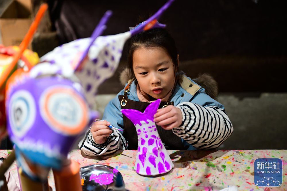 2月8日,小朋友在瞻淇村里體驗魚燈制作。
