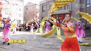 在杭州市余杭區的瓶窯老街,舞龍、花燈、竹馬等輪番上演,與熱鬧的市集一同營造出濃濃年味,吸引大批市民、游客。