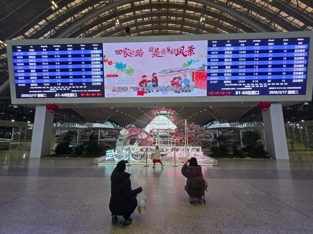 2月17日,高鐵武漢站內,父母給小朋友拍照。新華社記者汪平 攝