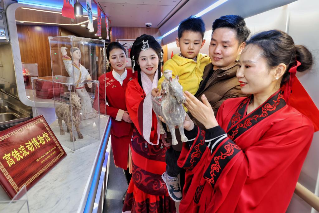 2月11日,西安北開往香港西九龍的G916次陜港高鐵列車上,身著漢服的工作人員向旅客展示漢代馬形文物復制品,并講解相關歷史文化。(國鐵西安局集團公司供圖)