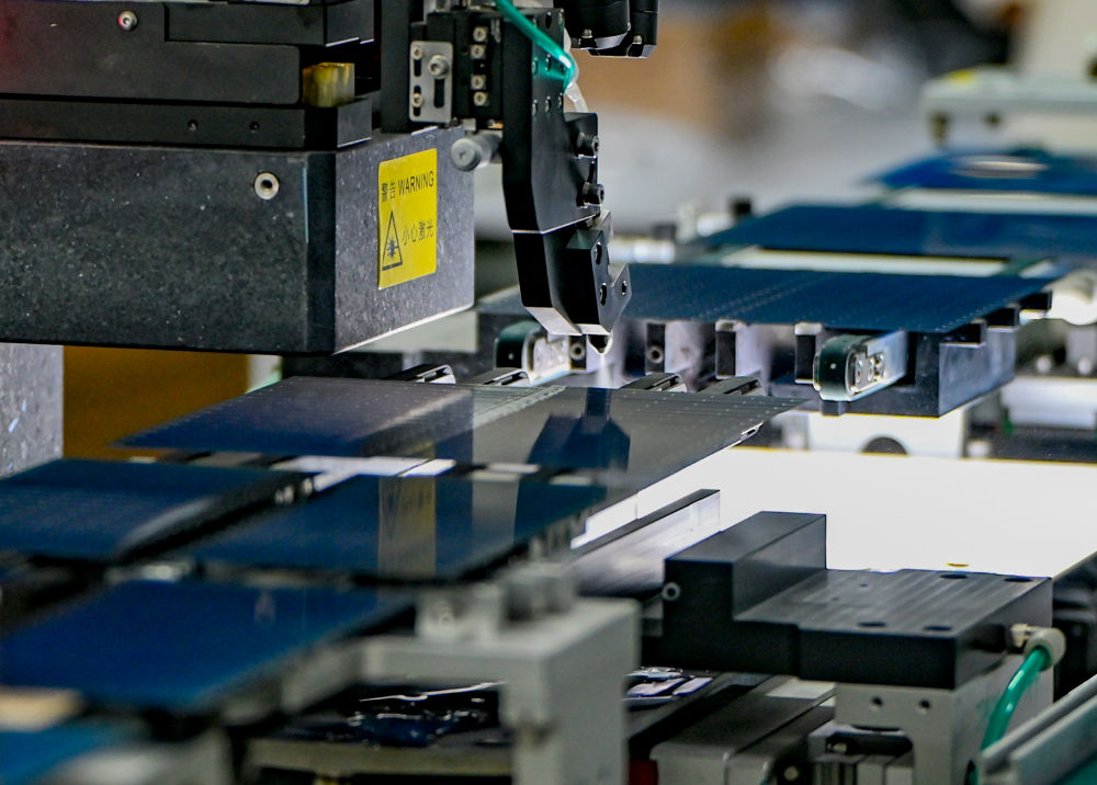 在新疆巴音郭楞蒙古自治州若羌縣一家新能源有限公司,全自動劃片機在切割光伏電池片(2025年9月22日攝)?!笆奈濉逼陂g,電動汽車、光伏產品、鋰電池等“新三樣”產品2025年出口規模接近1.3萬億元,比2020年增長3.5倍。
