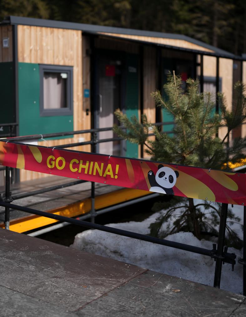 記者在主路兩側(cè)看到,已經(jīng)入駐的各個(gè)代表團(tuán)都在沿路進(jìn)行了個(gè)性化的裝飾:法國(guó)代表團(tuán)的橫幅上有高山的剪影,澳大利亞代表團(tuán)則擺放了一只戴著代表團(tuán)帽子和圍巾的鴯鹋塑像;中國(guó)代表團(tuán)橫幅上,一只憨態(tài)可掬的熊貓舉起爪子,旁邊寫著“GO CHINA(中國(guó)加油)!”的字樣。