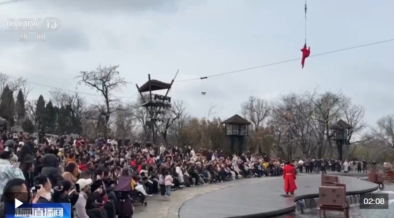 在河南開封的萬歲山武俠城景區,穿著戲服在臺上斷案的并不是演員,而是現場選取的游客。在這里,從街頭到巷尾,風格各異的演員帶著游客猜拳、破案、比武功,甚至一起走入劇情演繹角色。通過參與互動,游客還能賺取“銀票”在景區購物,沉浸體驗古代市井生活。景區里戰馬奔騰、云梯攻城等實景演出輪番上演。