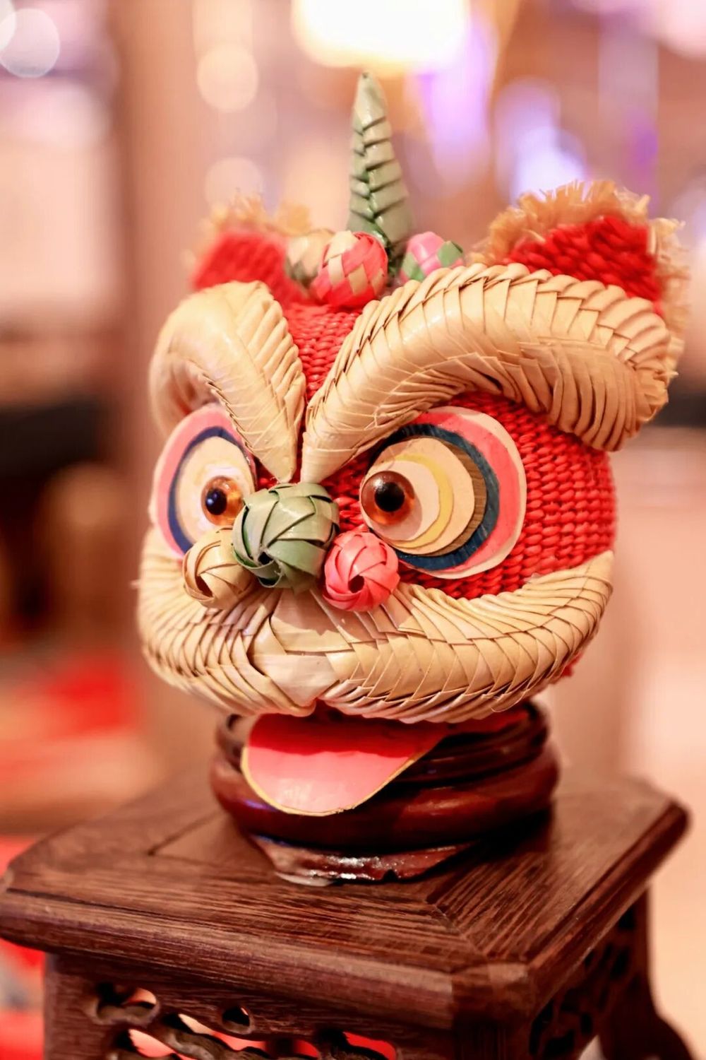 羅志勇棕編作品《醒獅》:選用優質棕櫚嫩葉經過采葉、劃葉、熏葉、泡葉、露葉、曬葉、高溫染色、編制等精心制作而成,作品色彩鮮艷,活靈活現。