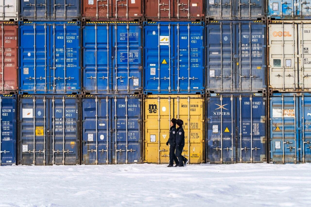 烏魯木齊鐵路公安處的民警正在貨柜存放區(qū)進(jìn)行安全巡視。