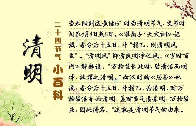 節選自《二十四節氣志》/宋英杰 4月5日前后為清明節氣,氣清景明之意,正是鳥語花香的盛春時節?!把匀f物去故而從新,莫不鮮明之謂也。”“萬物生長此時,皆清凈明潔,故謂之清明?!鼻迕髦惚碚髁诉@一時節的天氣是清新、明媚、和暖的。