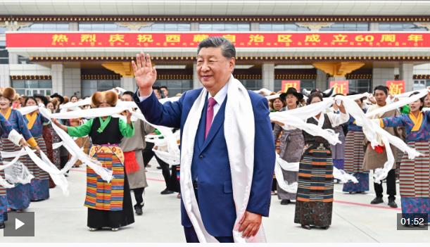 中共中央總書記、國家主席、中央軍委主席習近平率中央代表團20日中午乘專機抵達拉薩,出席西藏自治區成立60周年慶祝活動。習近平等在機場和拉薩市區受到西藏各族群眾的熱烈歡迎。中共中央政治局常委、全國政協主席、中央代表團團長王滬寧,中共中央政治局常委、中央辦公廳主任蔡奇等同機抵達。
