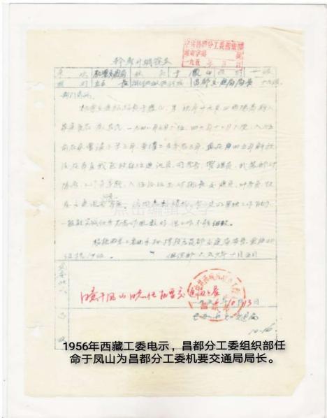 在1956年全國轟轟烈烈的社會主義改造高潮中,西藏迎來了一個劃時代的日子,4月22日西藏自治區籌備委員會成立,領導人講話都提到了民主改革問題。西藏工委在執行中央“慎重穩進”的過程中,準備在昌都、日喀則實行民主改革試點。因之接踵而來的是擴大機構增加人員,進行大力宣傳和試點。父親負責的昌都分工委機要交通站也在擴充之列,由機要交通站擴充為機要交通局,直屬昌都分工委領導。在西藏工委電示下,昌都分工委組織部下文任命父親為機要交通局局長,周孝山為副局長,從1956年10月16日走馬上任。母親非常清楚地記著機要交通局除了上面提到的幾位,還有陶躍忠、王佳廉、唐俊生、韓進先、鄭海超等近20多位從事機要交通的同志。