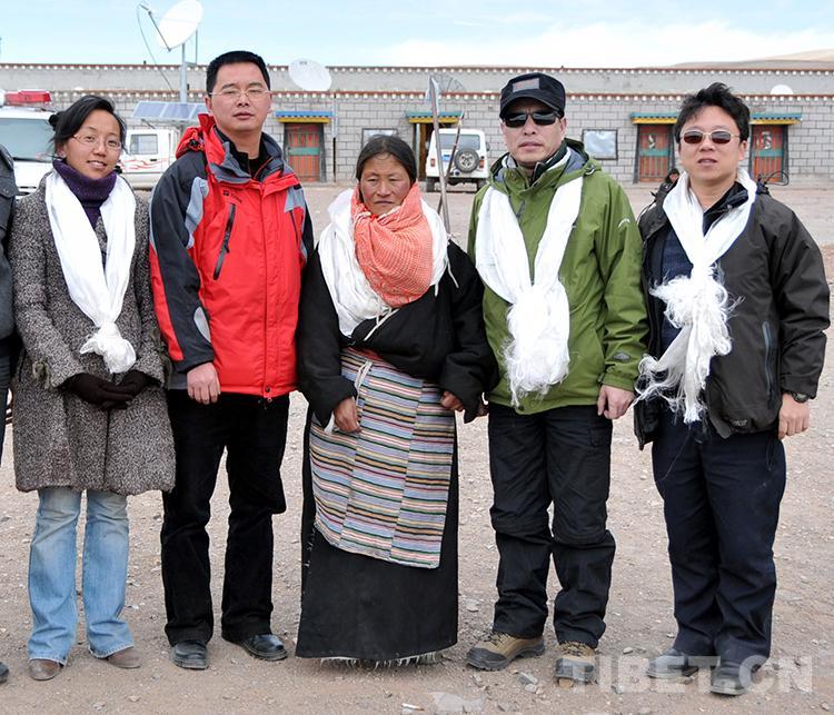 圖為中國(guó)石化第五批援藏干部、班戈縣副書記陳志清(左二)和常務(wù)副縣長(zhǎng)潘峰(右一)專程到班戈縣新吉鄉(xiāng)接脖子下長(zhǎng)著巨大腫瘤的牧女斯求卓瑪進(jìn)京治病時(shí),在鄉(xiāng)政府一同合影留念(王普2010年3月26日攝)