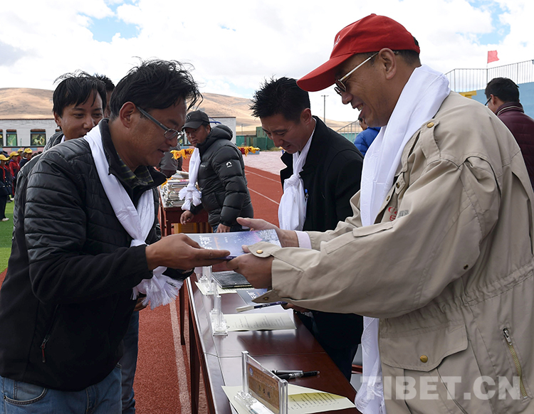 這是唐召明在向西藏那曲地區(qū)那曲縣(現(xiàn)那曲市色尼區(qū))師生捐贈(zèng)自己所撰寫(xiě)的《圓夢(mèng)“天路”》一書(shū)(王博軒2016年10月5日攝)