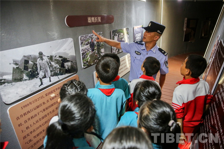圖為背崩邊境派出所民警在戰斗坑道教育長廊中向學生介紹墨脫邊境發展歷史