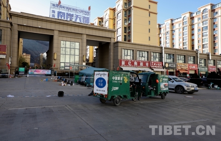 中國西藏網訊 隨著拉薩市疫情防控形勢整體持續向好,目前拉薩市郵政快遞業在落實好常態化疫情防控工作的基礎上,正有序復工復產。圖為快遞員無接觸配送快遞 攝影:賈華加(中國西藏網 記者/賈華加)