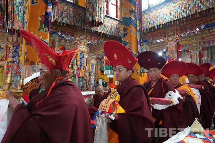 當日11時許,在眾僧的期盼中,班禪一行抵達直孔替寺。頓時,現場法號齊鳴、法螺合奏,直孔瓊倉·洛桑強巴活佛和僧眾在寺廟前舉行了隆重的歡迎儀式。