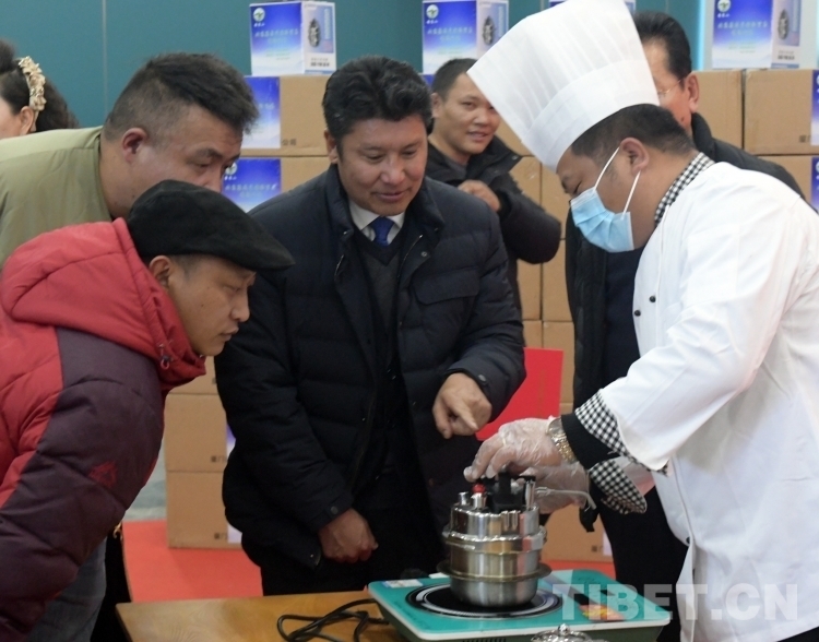 那曲市委常委、常務(wù)副市長(zhǎng)白瑪羅布(中)在捐贈(zèng)活動(dòng)現(xiàn)場(chǎng),觀(guān)看高原節(jié)能鍋的使用演示(唐召明2023年12月26日攝)