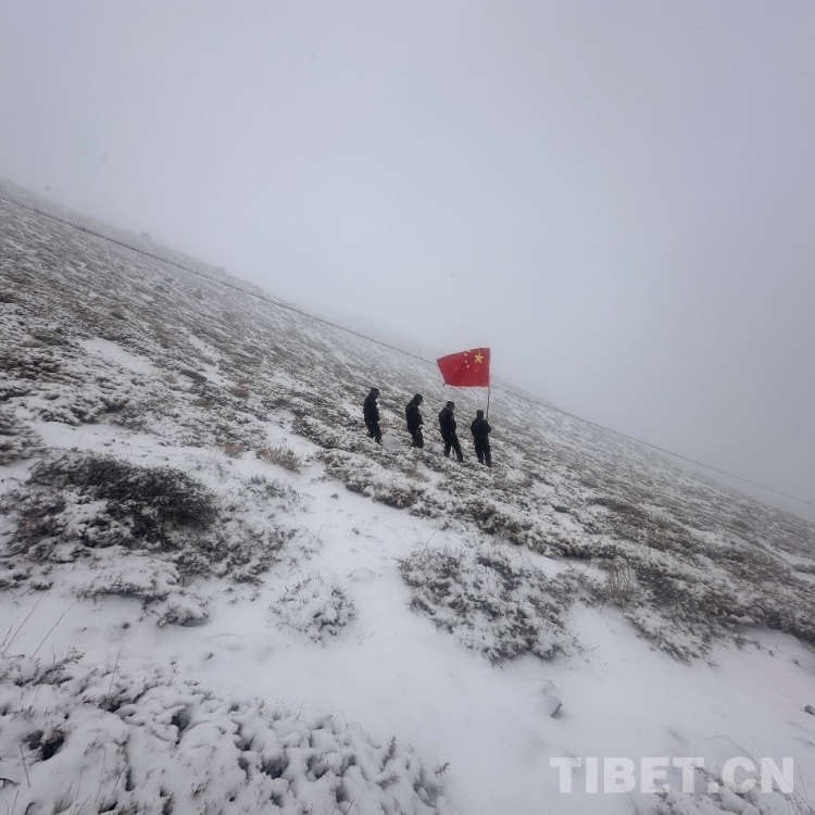 圖為斜爾瓦執勤點民警冒著風雪在中尼7號界樁旁巡邏踏查 攝影:格熱