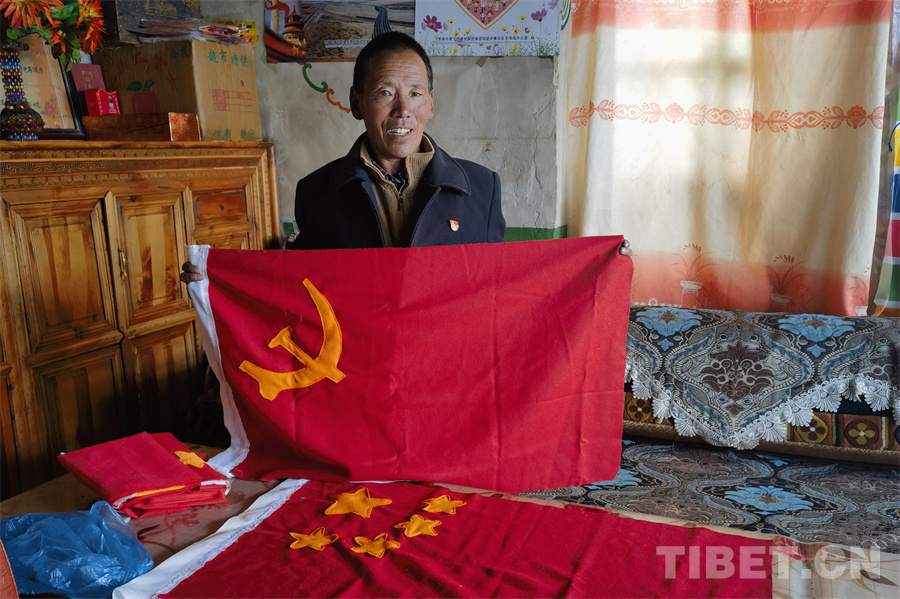 圖為多吉才覺展示親手縫制的國(guó)旗和黨旗 攝影:蔣馨悅