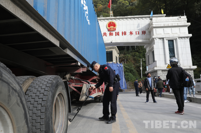 圖為聶拉木出入境邊防檢查站執勤民警查驗車輛 攝影:郭遠敬