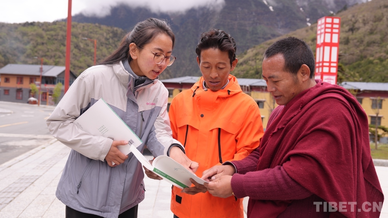 圖為西藏自治區藏語委辦(編譯局)工作人員為玉麥鄉群眾指導學習方法