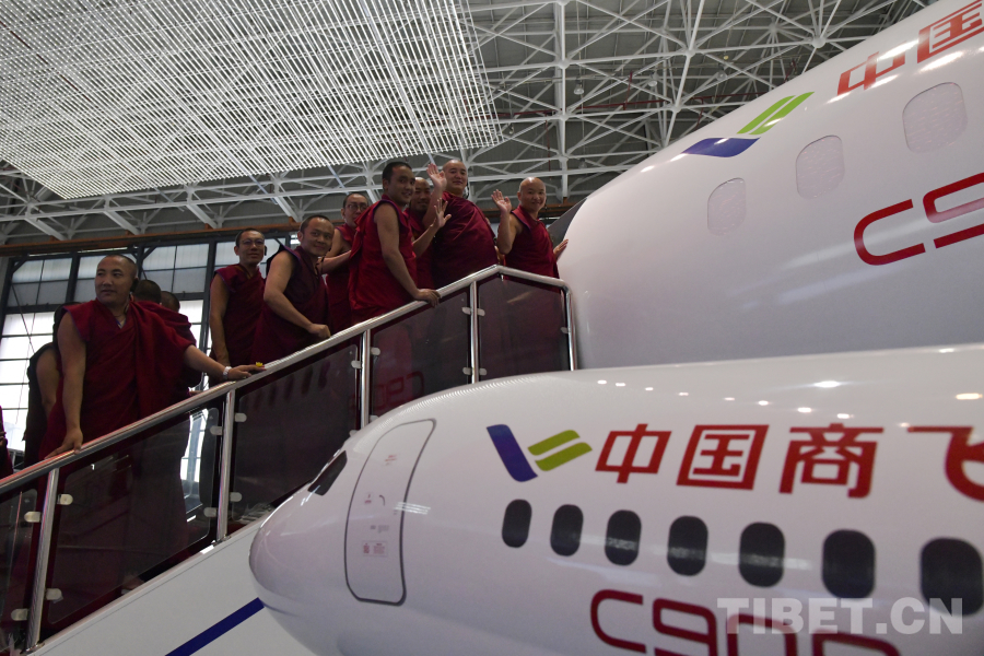 圖為西藏佛學院師生在中國商飛公司登上國產飛機C909模型機參觀 攝影:趙振宇