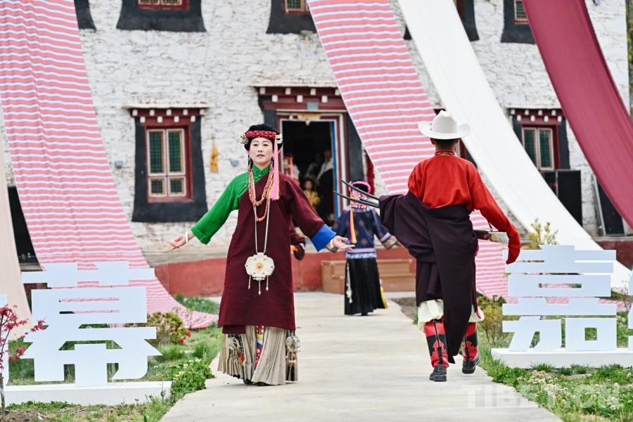 伴隨著輕快的嘉絨山歌,身著傳統嘉絨藏裝的當地村民款款走來。姑娘頭戴造型別致的嘉絨頭飾,身著色彩斑斕的百褶裙,裙擺隨著步伐輕輕搖曳;小伙則身穿長袍,腰系紅綢帶,頭戴白色氈帽,盡顯英武之氣。