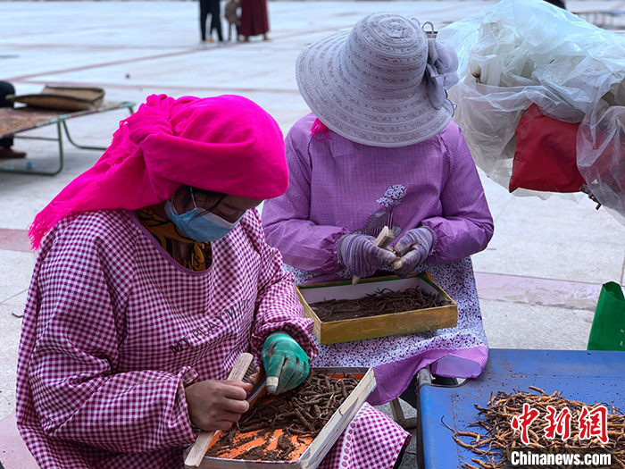 記者了解到,目前整個雜多蟲草廣場有十幾位刷草工,他們拿著折疊凳來回穿梭,碰到有需求的商家后立即就地干活。他們的收入由刷蟲草的數(shù)量決定,像王秀花這樣熟練的刷草工,一天能刷三四千根。“干草兩毛,濕草一毛,一天也能賺四五百塊錢。”王秀花說。