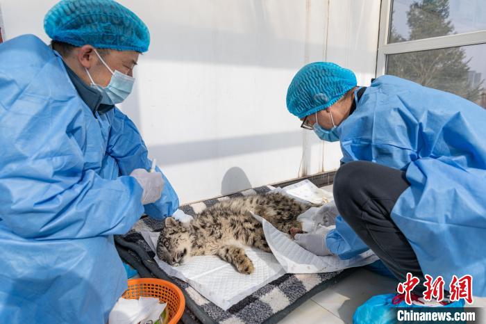 3月15日,救助人員為雪豹“凌小蟄”治療。(西寧野生動(dòng)物園供圖)