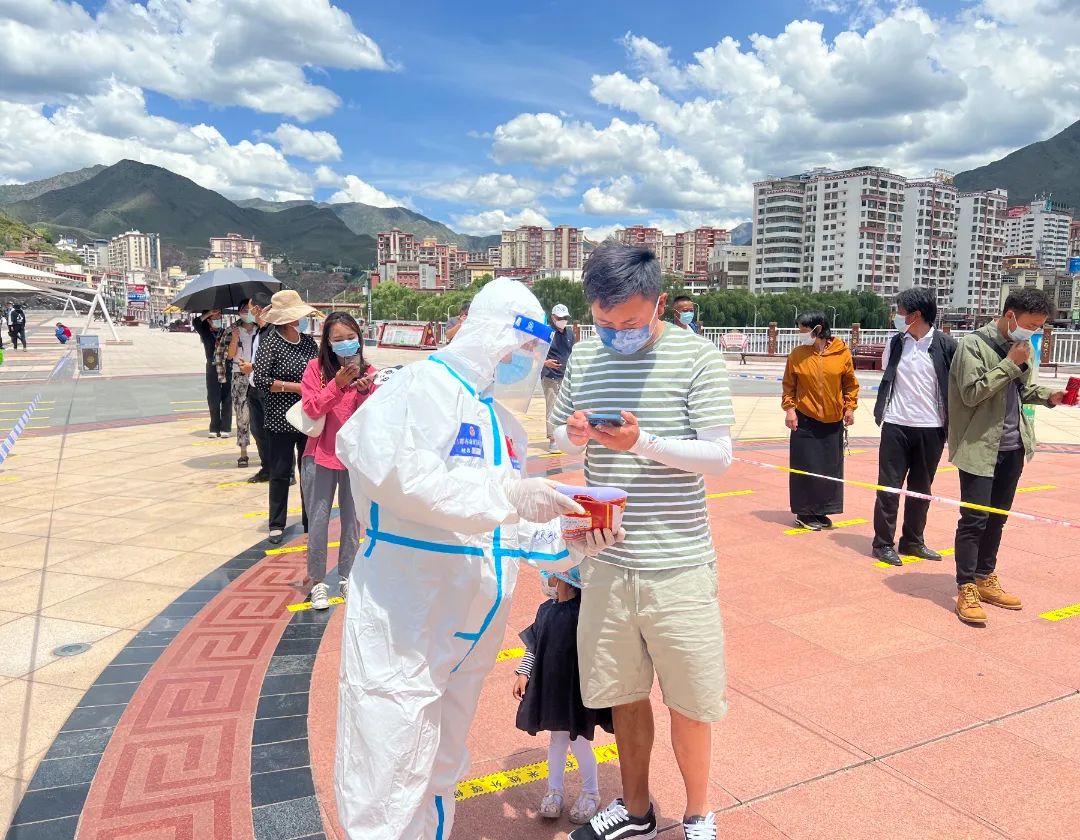 “為了您的安全,請保持1米以上間隔,謝謝。”晚上9點多,在茶馬廣場,支隊三級消防士張興梁,依然堅守在抗疫一線,維持著排隊做核酸的長隊。從早上7點開始,張興梁和其他消防隊員已堅守了14個多小時。“西藏晝夜溫差特大,白天防護服里面衣服都濕透了,但是到晚上這個點已經干了,正好不用換衣服了。”張興梁打趣的說到。