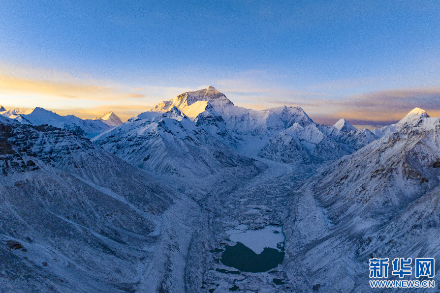 日出時分拍攝的珠穆朗瑪峰(無人機照片)。 新華網 旦增努布 攝