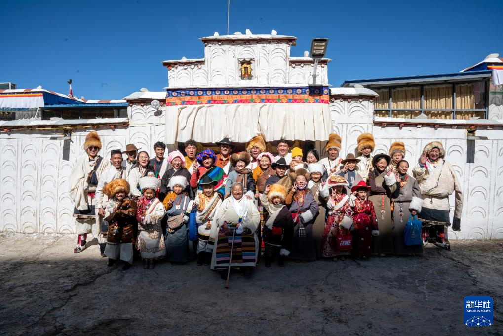 在拉薩市當雄縣公塘鄉甲根村,斯曲旺姆(前中)和家人們合影(2月10日攝)。新華社記者 丁增尼達 攝