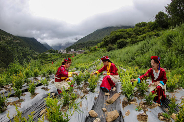 2022年,安徽省援藏工作隊在勒布溝引入莓茶種植,試驗性種植30畝。這是當地村民在采摘莓茶(2023年7月28日攝)。新華社記者 旦增尼瑪曲珠 攝