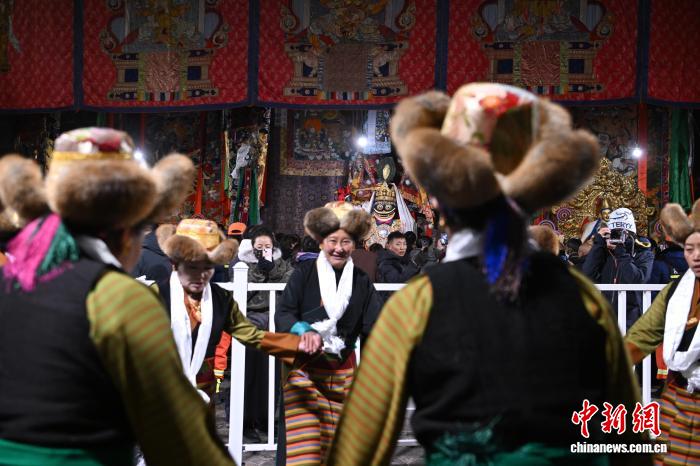 圖為身著民族服裝的信眾在大昭寺內載歌載舞。中新社記者 貢嘎來松 攝