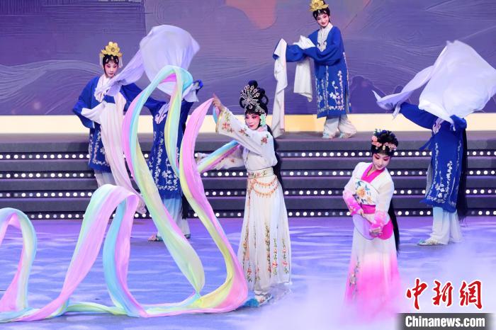 9月10日晚,2024江蘇中秋戲曲晚會在江蘇廣電荔枝大劇院上演,晚會緊扣“中秋”和“戲曲”兩大元素,將傳統節日內涵與戲曲藝術融為一體,戲曲界各劇種名家陳少云、趙志剛、竺小招、周東亮、李奕潔、陳澄、李曉旭、施夏明等“梅花獎”“紫金文化獎章”“文華表演獎”獲得者輪番登臺,與近年來涌現出的優秀青年演員同臺演出,凸顯戲曲文化的傳承與創新,為觀眾帶來一個流光溢彩的戲曲之夜。圖為戲曲演員們在舞臺上表演節目。中新社記者 泱波 攝