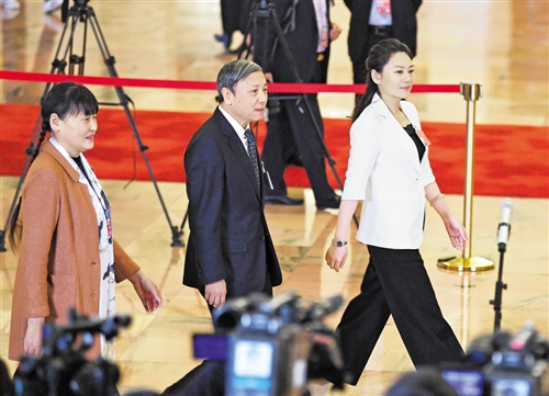 支月英代表、蔡昉代表、王欣會代表(從左至右)步入“代表通道”準備接受采訪。記者 李景錄攝