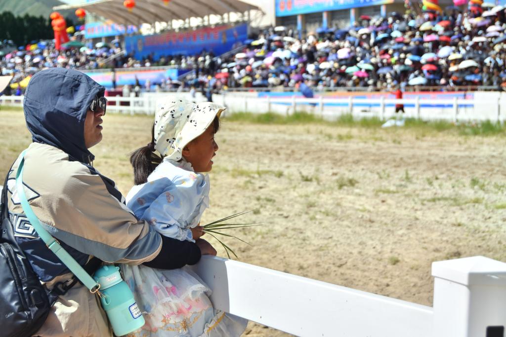 8月17日,2023拉薩雪頓節賽馬大會現場,一位父親帶著女兒來看比賽。新華社記者 劉文博 攝