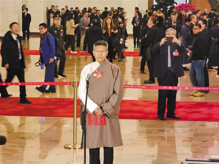 圖為3月7日上午,全國政協十四屆二次會議第二場“委員通道”集體采訪活動開啟。圖為住藏全國政協委員達瓦頓珠亮相“委員通道”并回答記者提問。