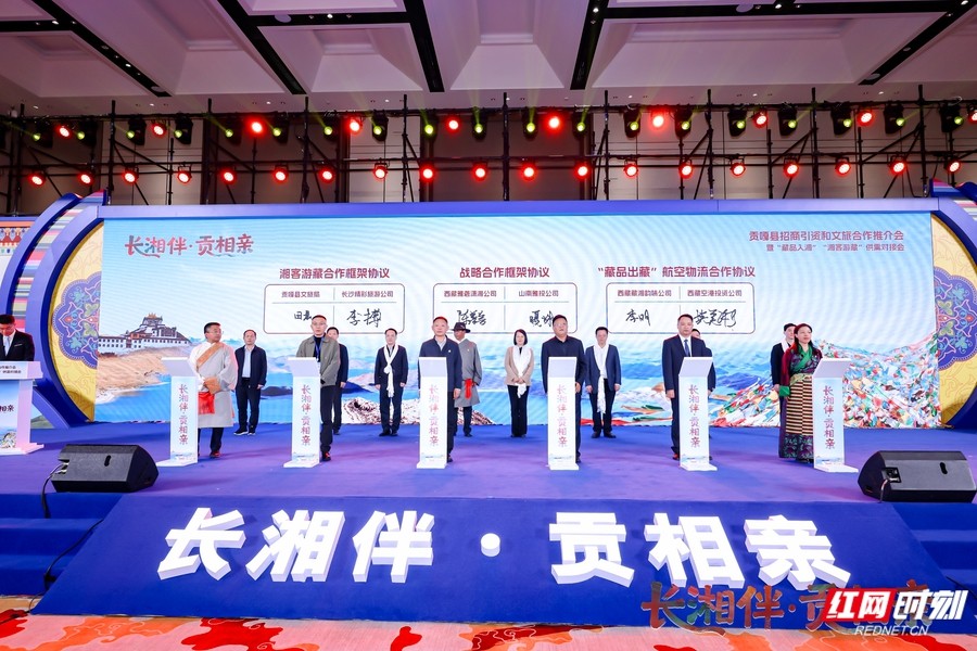 在簽約環節,貢嘎縣與多家企業就農產品采購、文旅合作達成共識。活動現場還揭牌成立“貢嘎藏品入湘與湘客游藏服務中心”“貢嘎大學生入湘就業服務中心”“貢嘎區外招商引資服務中心”,推動湘藏協作走向機制化、常態化。